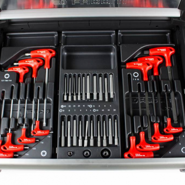 Dieser schwarze Facom Werkzeugwagen ist mit 22 Werkzeugmodulen bestückt. Der Wagen hat eine Arbeitsplatte aus Aluminium und kugelgelagerte Schubladen. Dieser Werkzeugwagen ist mit einer Lebensdauer der FACOM Werksgarantie ausgestattet und bietet beste Qualität.